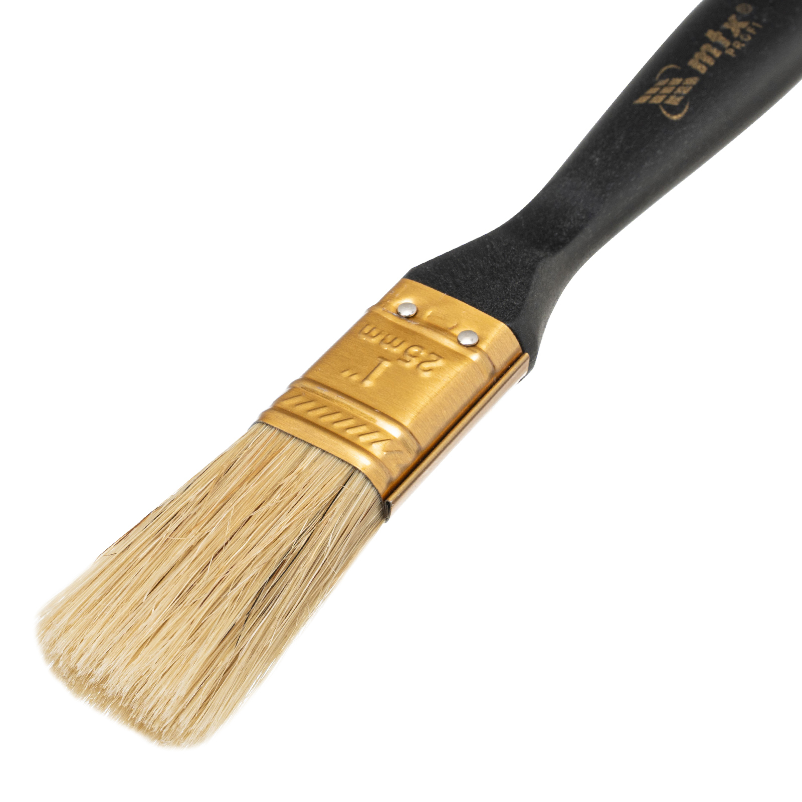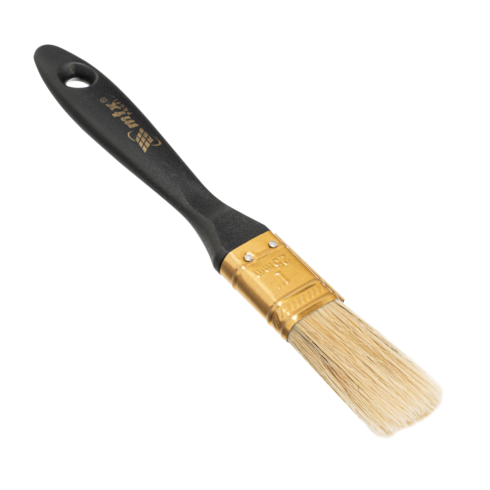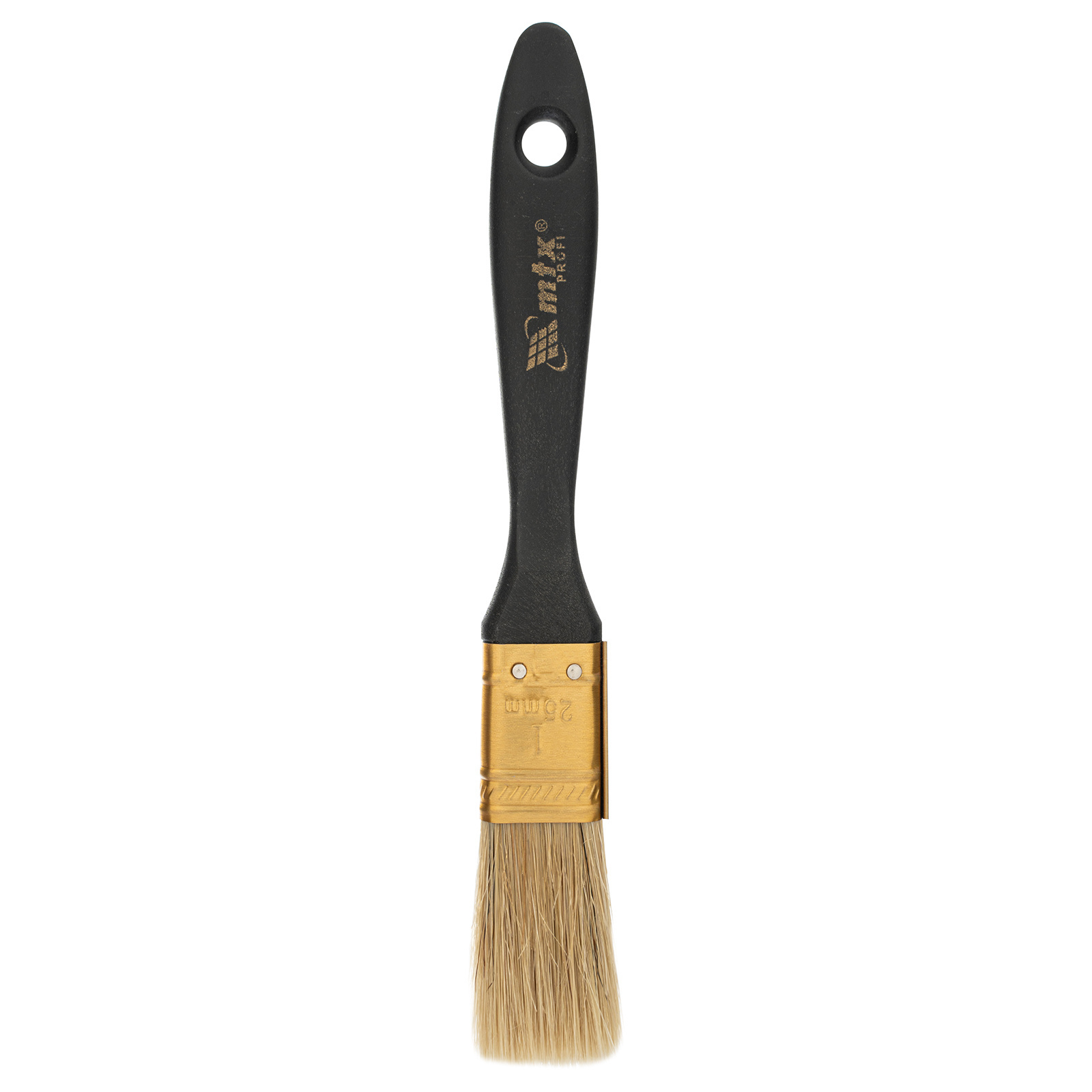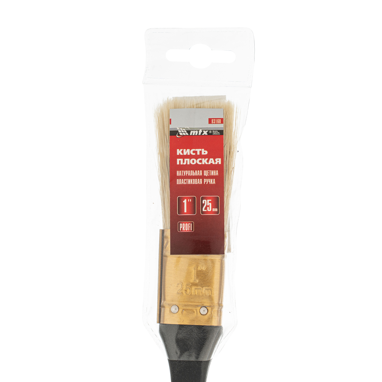 Плоская кисть «Профи» MTX 83160 шириной 1 дюйм, с натуральной щетиной и пластмассовой ручкой, рассчитана на профессиональное выполнение малярных работ. Натуральная щетина с увеличенной плотностью набивки подходит для нанесения различных типов ЛКМ, в том числе содержащих растворители.ПреимуществаШирина 25 мм — кисть оптимальна для окрашивания тонких труб, решеток, плинтусов и других узких поверхностей.Высокий ресурс — кисть премиум качества легко выдерживает интенсивное и многократное использование.Равномерное окрашивание — щетина двойной выварки не содержит посторонних примесей, а расщепленные кончики обеспечивают высокий показатель впитываемости и отдачи краски.Простой уход — кисть можно мыть, т.к. антикоррозийное покрытие защищает бандаж от разрушения.Комфортная работа — пластмассовая рукоятка удобно ложится в руку.Практичное хранение — в рукоятке имеется отверстие для подвешивания на крючок.