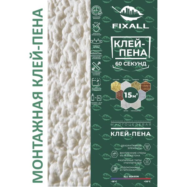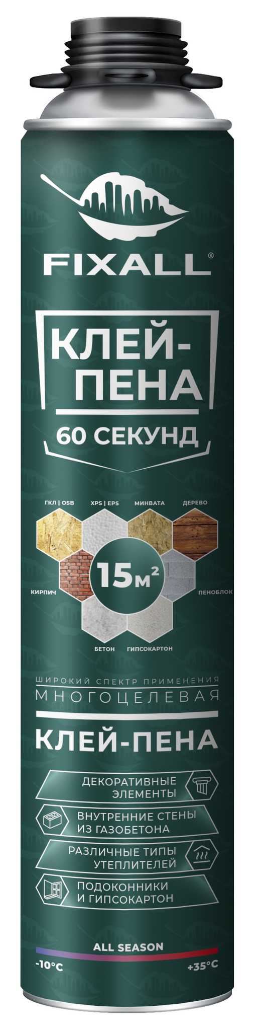 Представляем FIXALL – профессиональный однокомпонентный полиуретановый клей-пена, разработанный для быстрой и прочной фиксации широкого спектра строительных и теплоизоляционных материалов. Этот всесезонный продукт без вторичного расширения обеспечивает превосходное сцепление с бетоном, кирпичом, деревом, металлом и другими поверхностями.