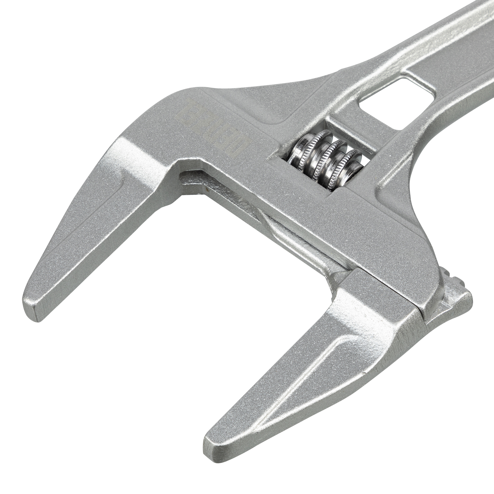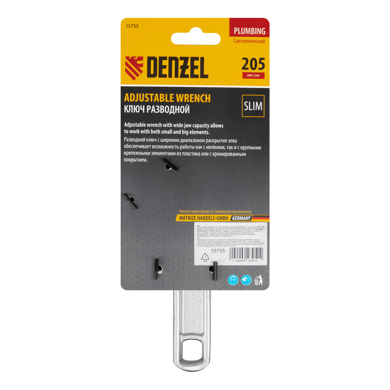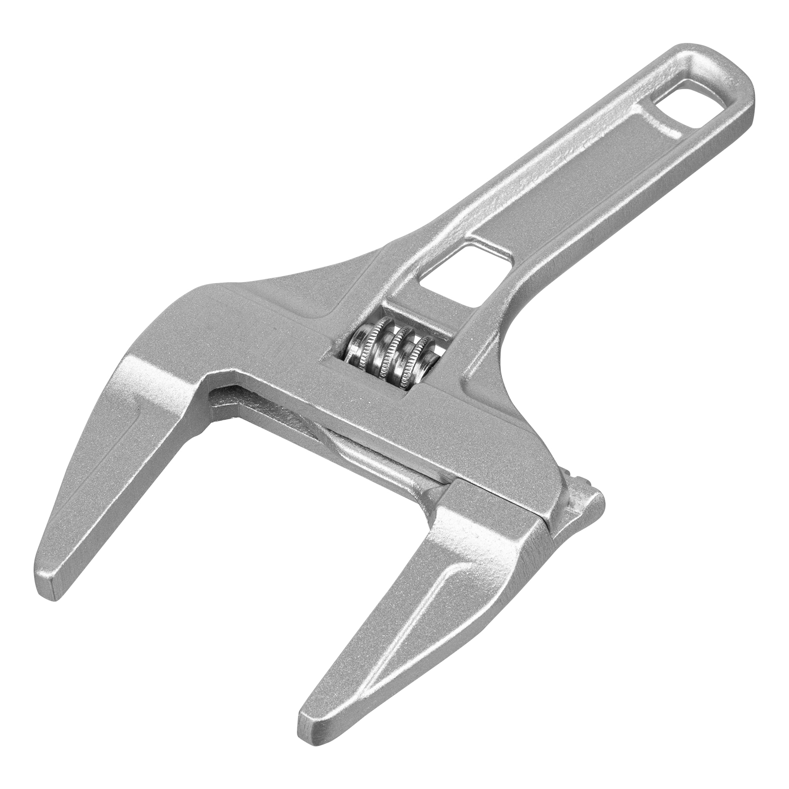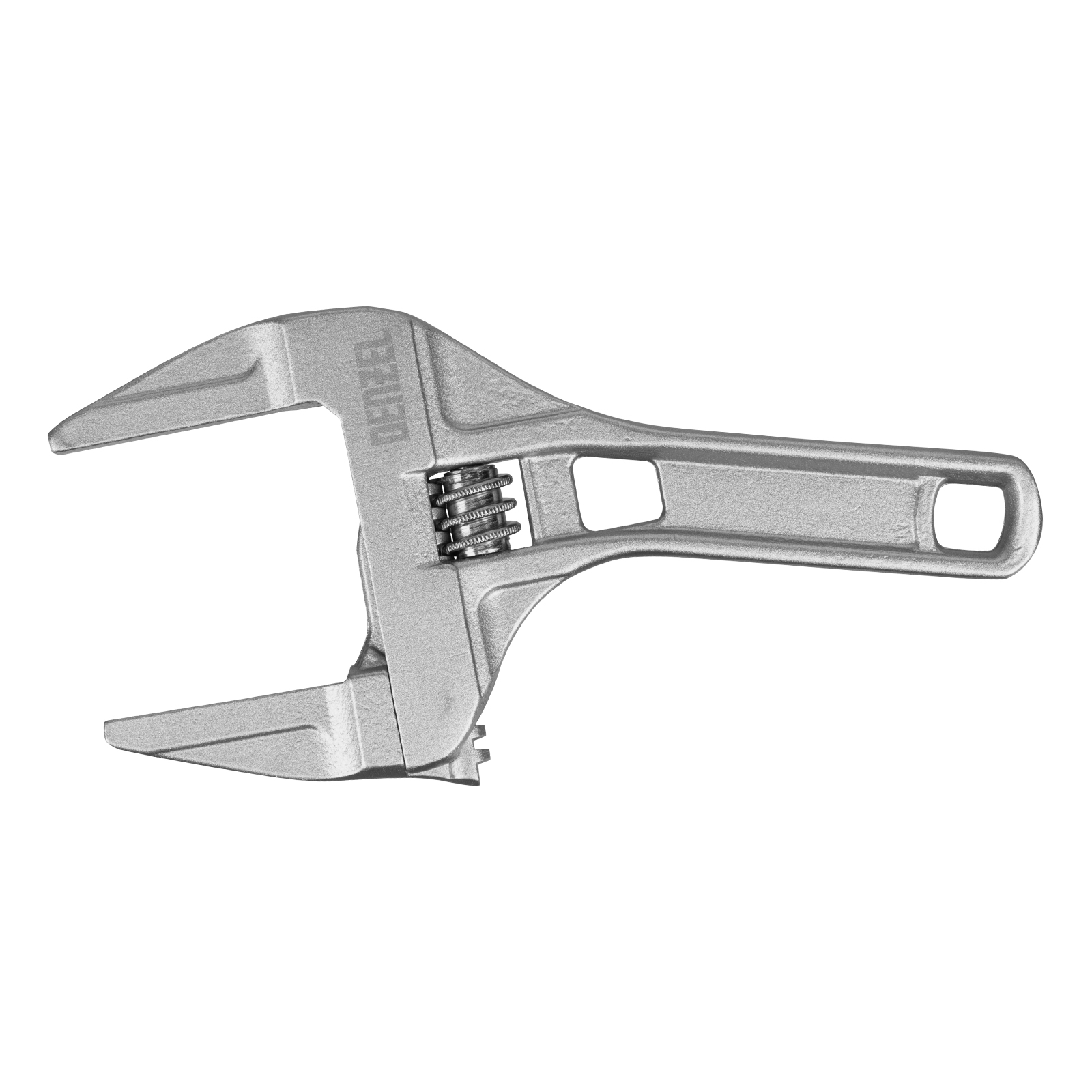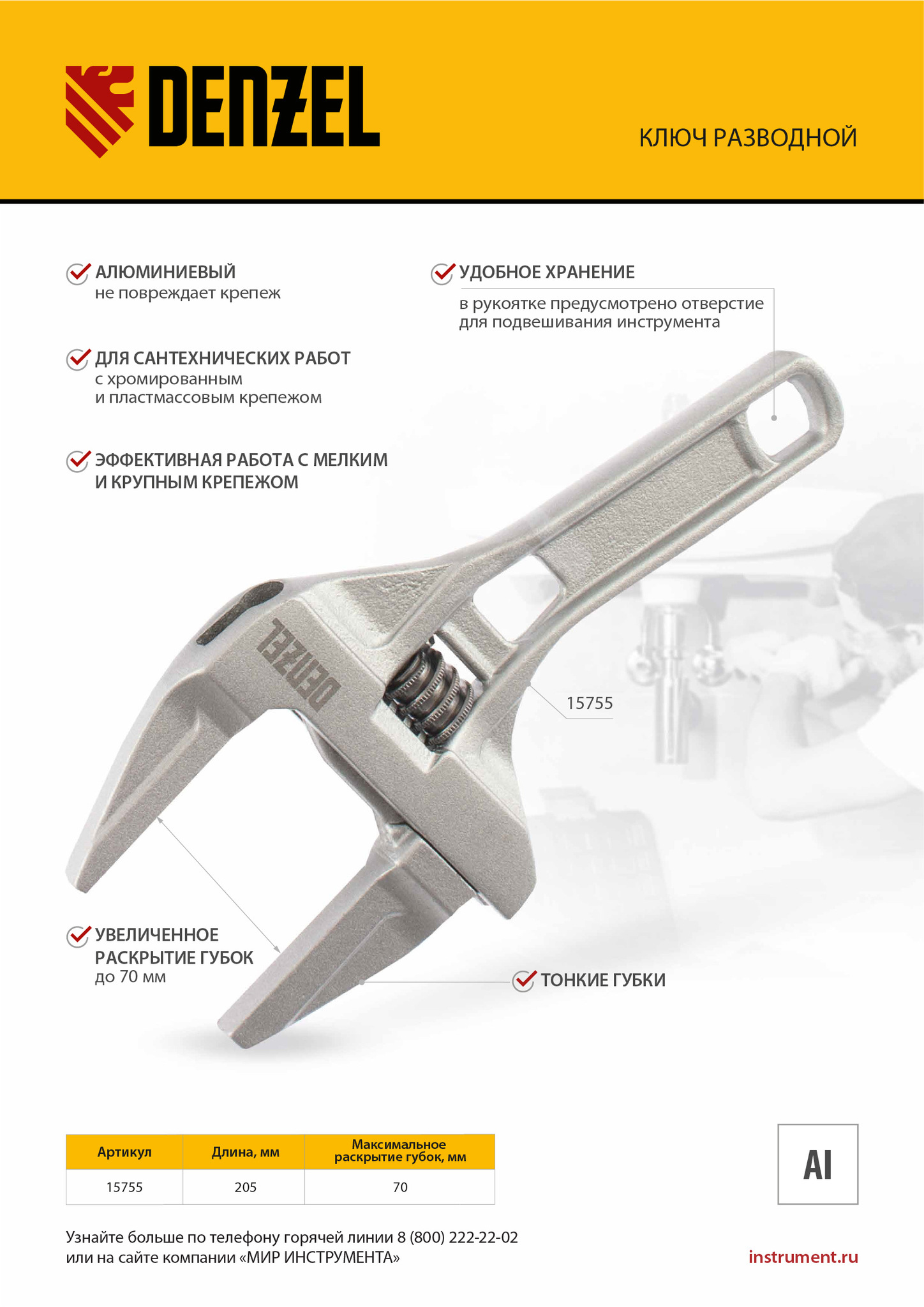 Ключ разводной алюминиевый Denzel 15755 длиной 205 мм, с тонкими губками, оптимален для монтажа и демонтажа хромированных и пластмассовых крепежных элементов. Используется при выполнении сантехнических работ.Преимущества Аккуратная работа — ключ изготовлен из коррозионностойкого алюминия и не повреждает крепеж. Эффективная работа с мелким и крупным крепежом — диапазон раскрытия губок увеличен до 70 мм. Удобное хранение — в рукоятке предусмотрено отверстие для подвешивания инструмента.