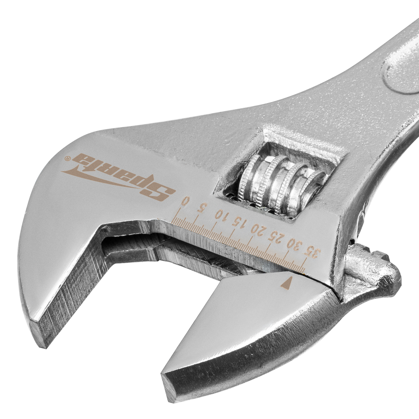 Хромированный разводной ключ Sparta 155355 длиной 300 мм — инструмент для выполнения мелких ремонтных работ. Регулировка размера зева позволяет работать с различными крепежами, в том числе нестандартных размеров. Ключ пригодится слесарям, сантехникам, автомеханикам и начинающим мастерам.ПреимуществаДолгий срок службы — ключ выполнен из инструментальной углеродистой стали 45 и прошел селективную закалку.Антикоррозийная защита — хромовое покрытие предохраняет червячный винтовой механизм от воздействия влаги.Точный захват деталей — на ключ нанесена градуировка, а на подвижную губку — точечная риска.