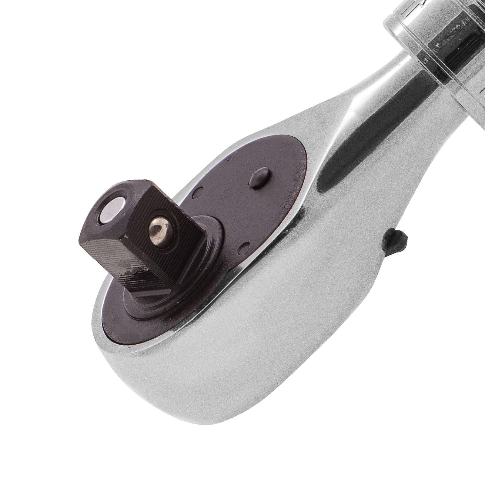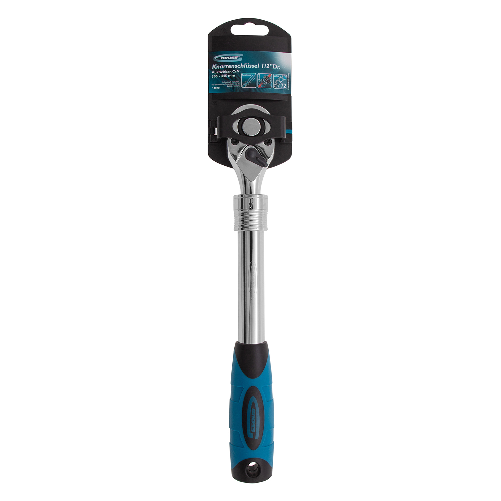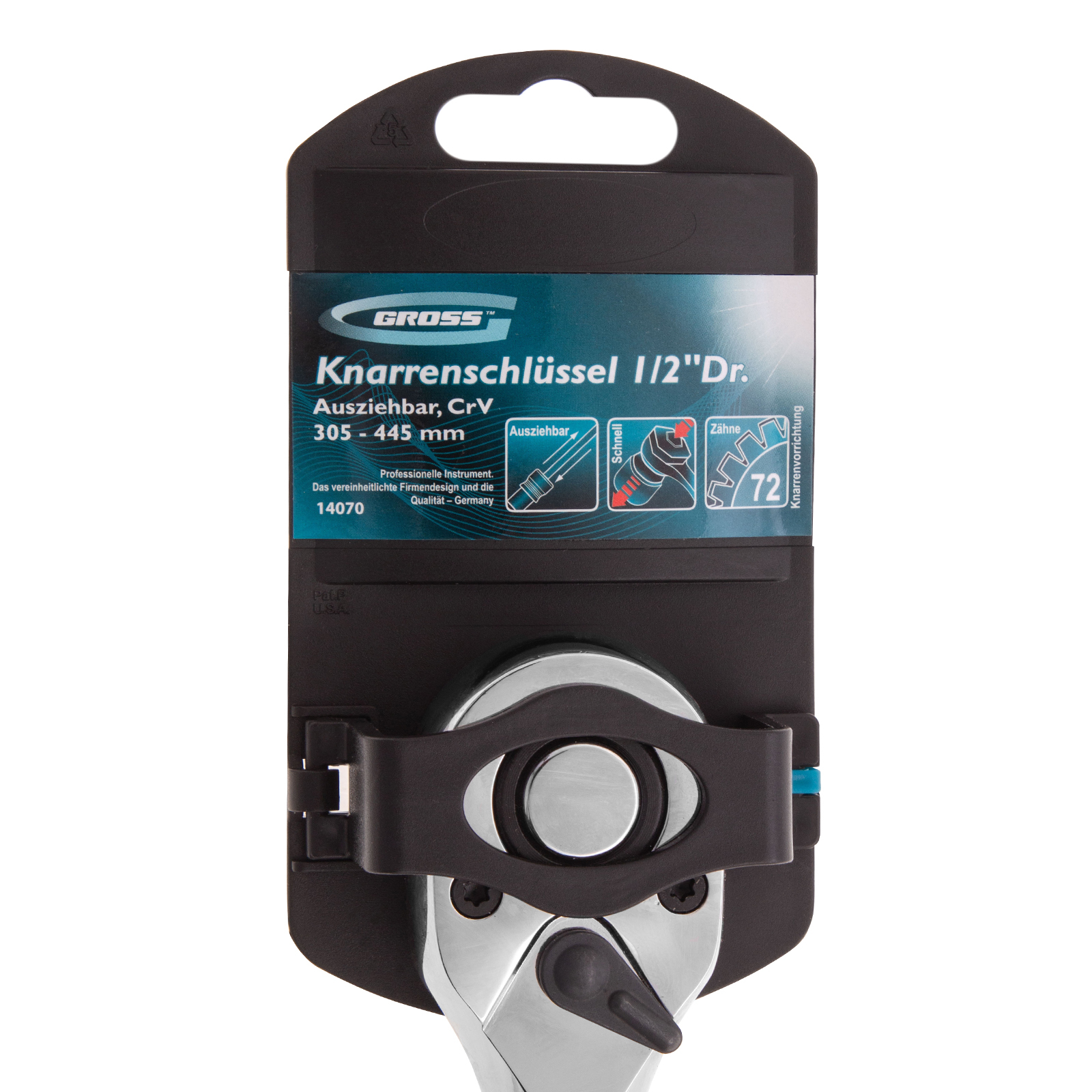 Телескопический хромированный трещоточный ключ Gross 14070, 305-445 мм, из стали CrV, с присоединительным квадратом 1/2 дюйма и 2-компонентной рукояткой, предназначен для монтажных работ с резьбовыми соединениями. Особенно удобен для работы в труднодоступных местах, т.к. имеет запатентованный механизм фиксации телескопической рукоятки. Ее длину можно изменить с 305 до 445 мм. Инструмент используется в слесарных мастерских, автосервисах, пригодится и в быту.Преимущества Высокая износостойкость — ключ-трещотка изготовлен из прочной стали хромованадиевой группы. Долговечность — хромированная поверхность устойчива к ржавчине и воздействию агрессивных веществ. Расширенные возможности — реверсивный механизм позволяет использовать инструмент как для закручивания, так и для откручивания крепежей. Легкая замена оснастки — кнопка быстрого сброса упрощает съем и установку насадок. Высокая плавность работы — храповый механизм с 72 зубцами имеет шаг 5 градусов. Надежная фиксация насадки — благодаря присоединительному квадрату с шариком оснастка не соскакивает во время работы. Комфортная эксплуатация — удобная двухкомпонентная ручка надежно ложится в руку и не выскальзывает из ладони.