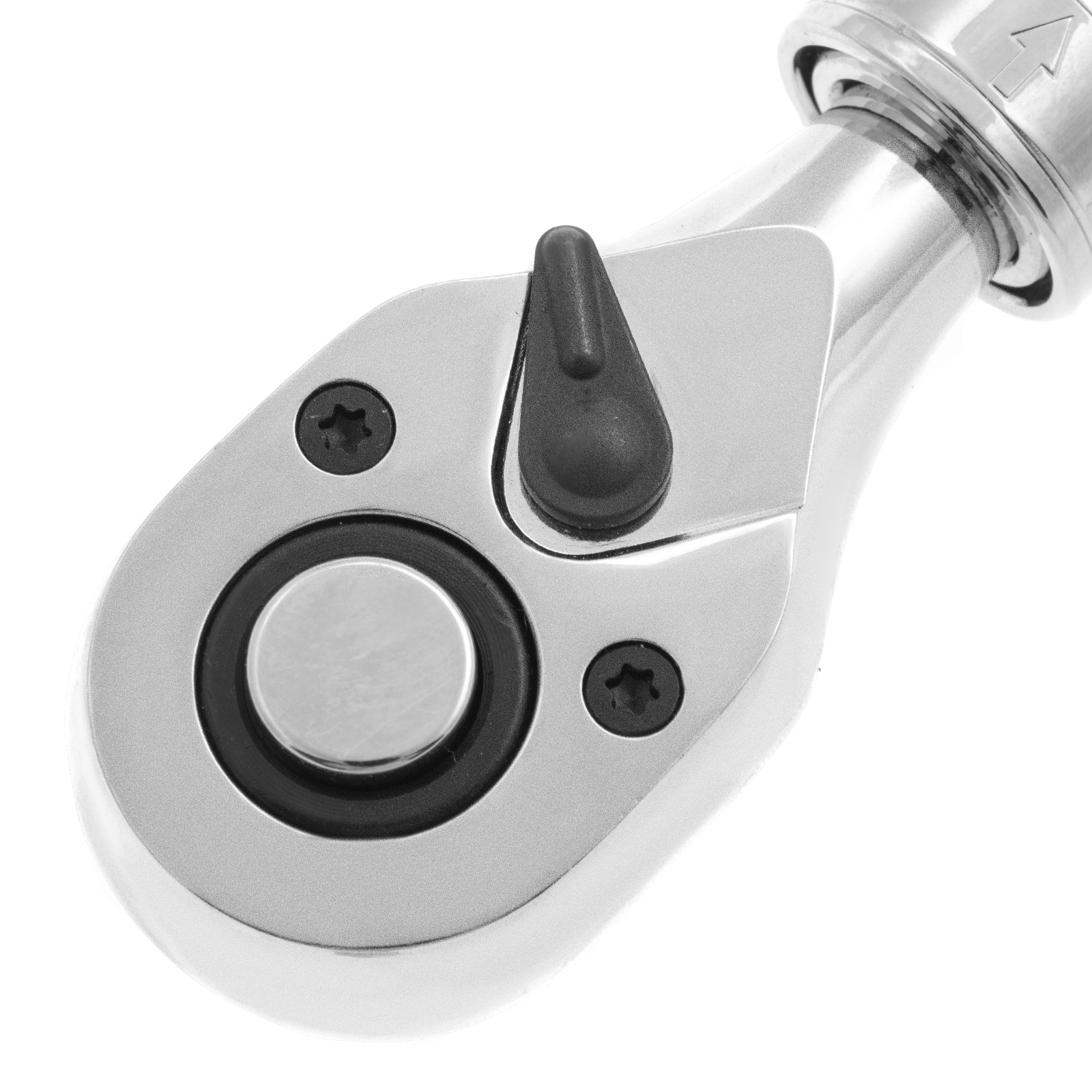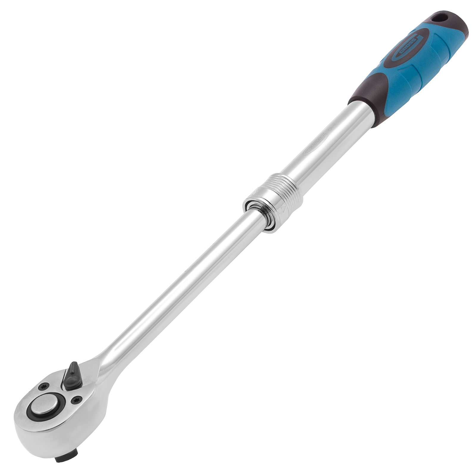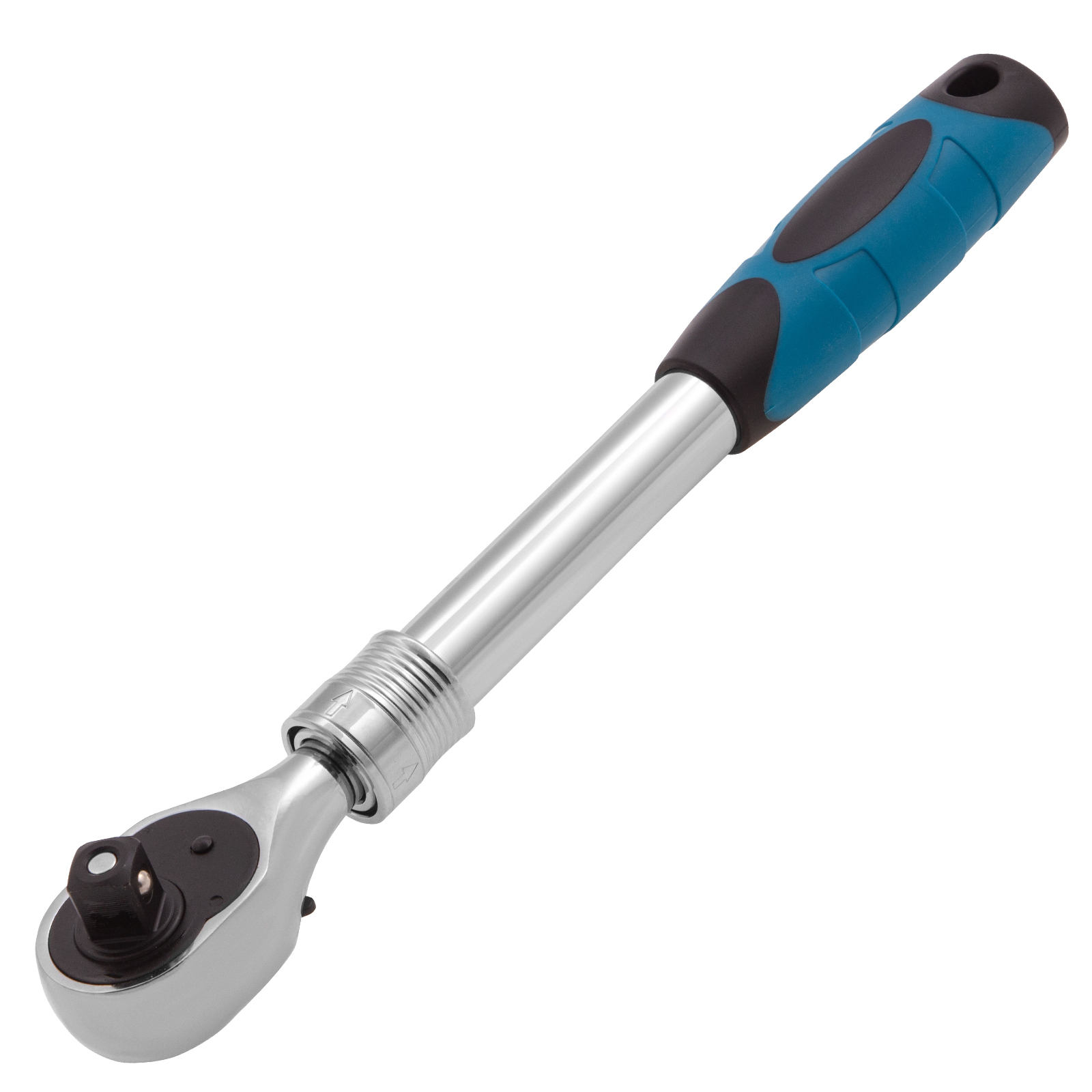 Телескопический хромированный трещоточный ключ Gross 14070, 305-445 мм, из стали CrV, с присоединительным квадратом 1/2 дюйма и 2-компонентной рукояткой, предназначен для монтажных работ с резьбовыми соединениями. Особенно удобен для работы в труднодоступных местах, т.к. имеет запатентованный механизм фиксации телескопической рукоятки. Ее длину можно изменить с 305 до 445 мм. Инструмент используется в слесарных мастерских, автосервисах, пригодится и в быту.Преимущества Высокая износостойкость — ключ-трещотка изготовлен из прочной стали хромованадиевой группы. Долговечность — хромированная поверхность устойчива к ржавчине и воздействию агрессивных веществ. Расширенные возможности — реверсивный механизм позволяет использовать инструмент как для закручивания, так и для откручивания крепежей. Легкая замена оснастки — кнопка быстрого сброса упрощает съем и установку насадок. Высокая плавность работы — храповый механизм с 72 зубцами имеет шаг 5 градусов. Надежная фиксация насадки — благодаря присоединительному квадрату с шариком оснастка не соскакивает во время работы. Комфортная эксплуатация — удобная двухкомпонентная ручка надежно ложится в руку и не выскальзывает из ладони.