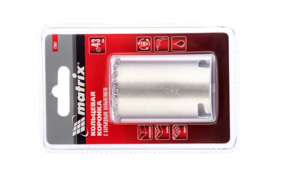 Кольцевая коронка с карбидным напылением Matrix 72847 диаметром 43 мм — сменный режущий элемент для дрелей и перфораторов. Предназначена для сверления отверстий в керамической плитке, ячеистом бетоне, пенобетоне, газосиликате, кирпиче. Пригодится для монтажа проводки в доме. Используется совместно с державкой Matrix 72860 и центрирующим сверлом Matrix 72862 (не входят в комплект поставки).ПреимуществаРабочая часть из сплава карбида вольфрама ВК6 отличается высокой прочностью.Корпус коронки покрыт эмалью для защиты от коррозии.Работа в безударном режиме и с использованием водяного охлаждения обеспечивает высокое качество реза.