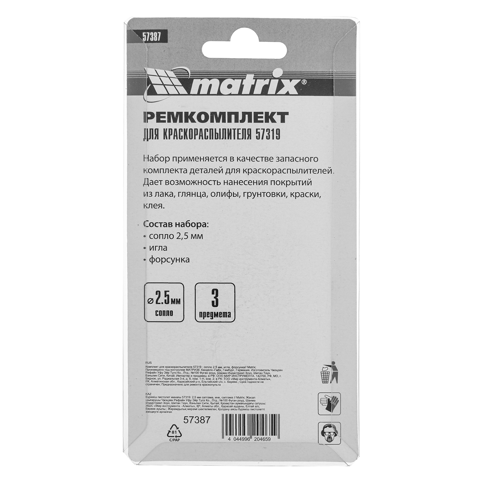 Комплект Matrix 57387 для краскораспылителя Matrix 57319 включает в себя 3 предмета: сопло диаметром 2,5 мм, иглу и форсунку. Их можно использовать для ремонта инструмента или расширения его функциональных возможностей.ПреимуществаВсе предметы изготовлены из высококачественной стали и латуни, поэтому устойчивы к механическим повреждениям.Сопло диаметром 2,5 мм подходит для распыления лаков, олифы, грунтовки, клея и красок, в том числе глянцевых.Форсунка обеспечивает нанесение покрытия по технологии HVLP (High Volume Low Pressure, высокий объем, низкое давление), уменьшая потери краски.Игла мгновенно открывает и закрывает сопло, позволяя точно контролировать подачу лакокрасочного материала.