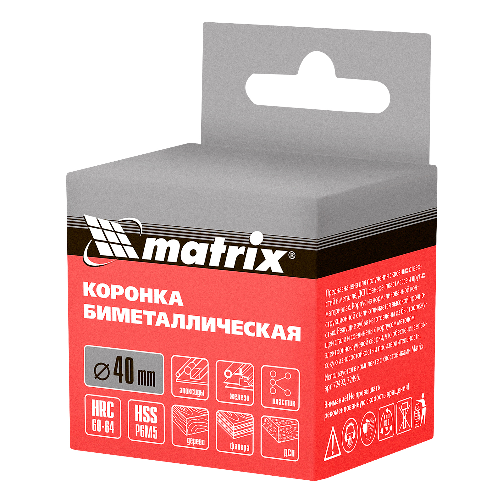 Коронка Matrix BIMETAL 72440 диаметром 40 мм — режущий инструмент, который устанавливается на дрель, перфоратор или стационарный станок. Используется для быстрого сверления черных и цветных металлов, пластика и других материалов. Позволяет получить отверстия большого диаметра при проведении электромонтажных работ и прокладке коммуникаций.ПреимуществаНадежная конструкция — корпус выполнен из углеродистой стали, зубья приварены методом электросварки.Эффективность — рабочая часть из быстрорежущей стали обеспечивает высокую скорость сверления.Совместимость с разными типами патронов — на коронку можно установить хвостовик с шестигранным или SDS PLUS профилем Matrix 72490, 72492, 72494, 72496 (приобретается отдельно).