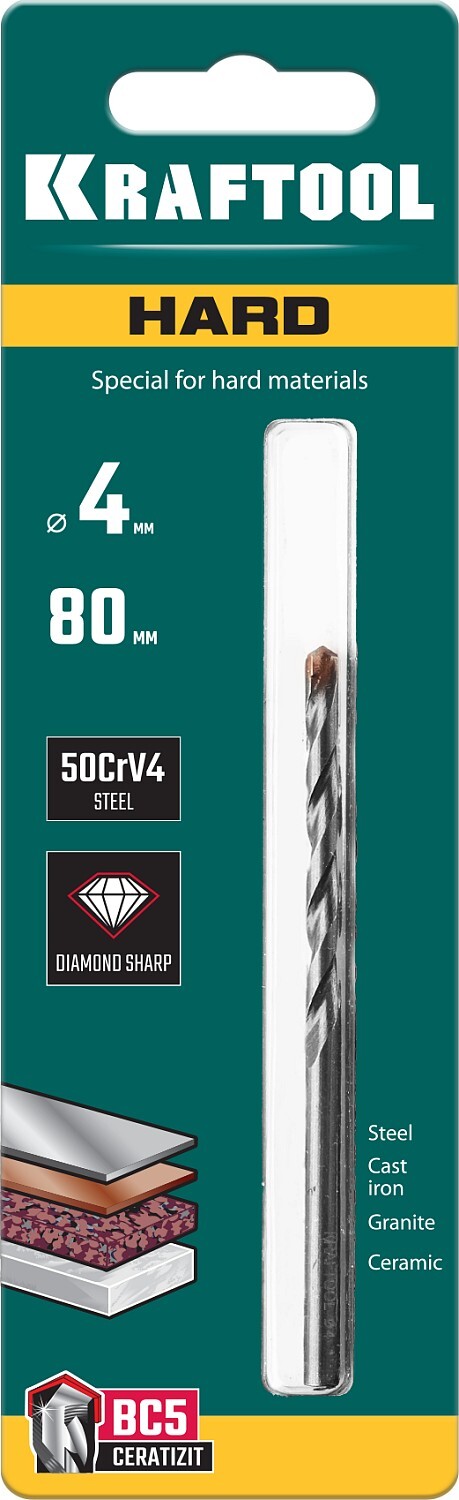Сверла специальные HARD по твёрдым материалам подходят для сверления быстрорежущих сталей, подшипниковой стали, чугуна, керамики, гранита, а также бетона и кирпича.