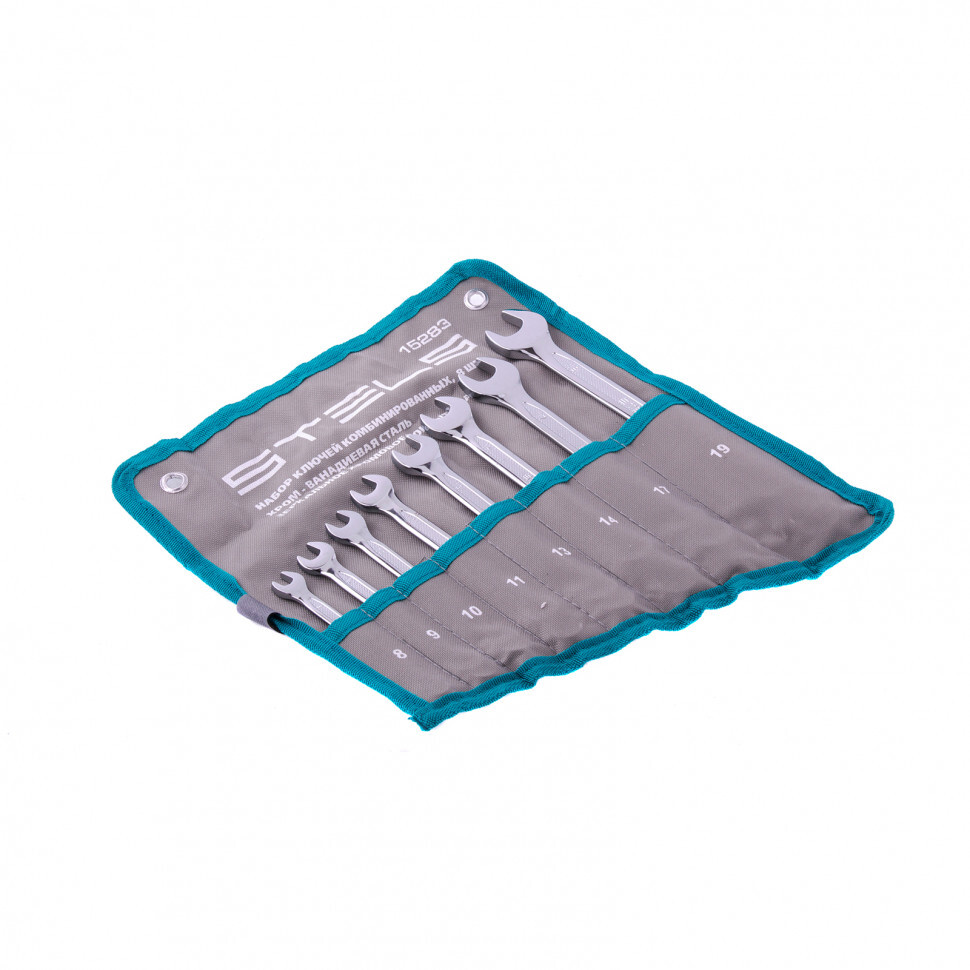 Набор Stels 15283 включает 8 комбинированных ключей из стали CrV, размером от 8 до 19 мм, антислип, которые позволяют откручивать и закручивать резьбовые соединения. Они универсальны в применении, т.к. имеют кольцевую и рожковую головки. 12-гранный профиль накидного зева обеспечивает увеличенную площадь контакта с поверхностью крепежа, что минимизирует вероятность его деформации. Ключи будут полезны в автомастерской, для монтажа и демонтажа оборудования, пригодятся для работ по дому.ПреимуществаВысокий показатель прочности — инструменты изготовлены из стали хромованадиевой группы, твердость рабочих частей составляет 42-50 HRC.Улучшенные антикоррозионные свойства и повышенная износостойкость благодаря хромированному покрытию.Удобство при выполнении монтажных работ — кольцевой зев каждого ключа смещен на 15 градусов относительно его тела.Надежный хват — благодаря рельефной поверхности ключи не скользят в руке.