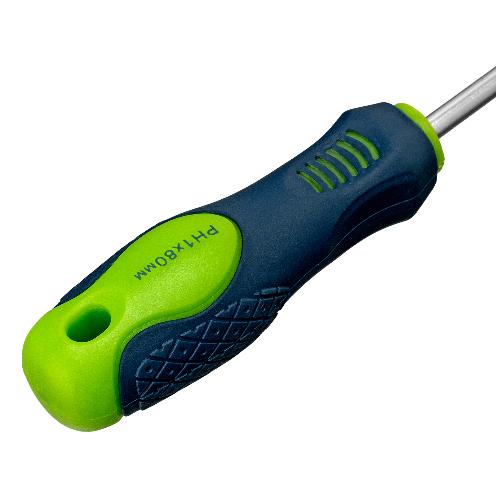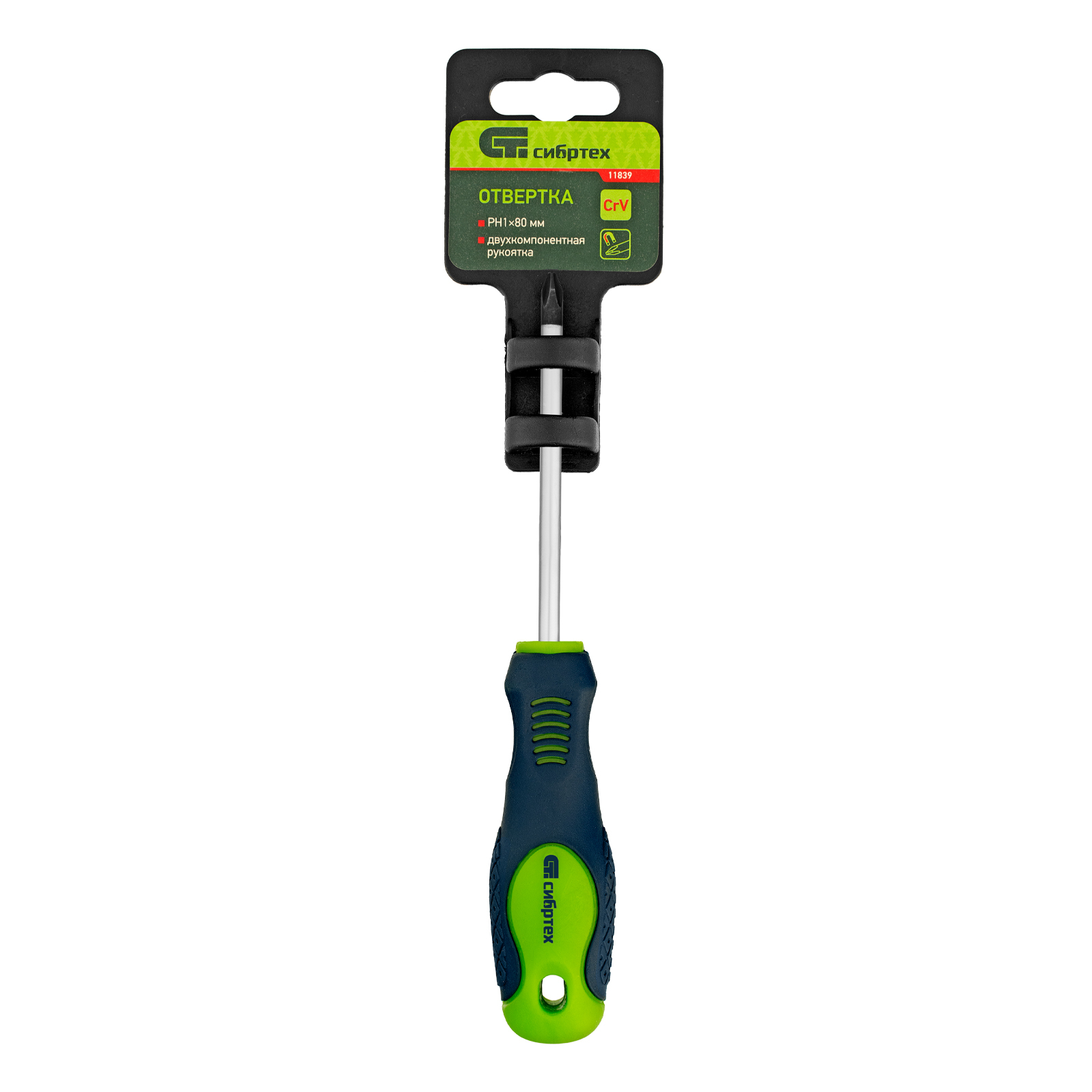 Отвертка Сибртех 11839, PH1 х 80 мм, из стали CrV, с 2-х компонентной рукояткой и крестовым шлицем позволяет проводить монтаж/демонтаж крепежных элементов типа Phillips. Она поможет произвести ремонт бытовой техники, повесить полки, собрать мебель и выполнить другие работы. Отвертка относится к полупрофессиональному классу инструментов. Благодаря стержню длиной 80 мм ей можно работать в углублениях и на поверхностях.ПреимуществаСтержень из хромованадиевой стали твердостью 50-54 HRC обладает высокими прочностными характеристиками.Фосфатированный наконечник стержня обеспечивает улучшенное сцепление со шлицем крепежа.Специальная маркировка, нанесенная на рукоятку, с обозначением типа шлица и длины стержня помогает быстро найти нужный инструмент.Удобная двухкомпонентная рукоятка имеет ромбовидные насечки и подпальцевые выемки для снижения нагрузки на запястье.
