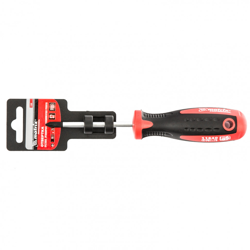 Отвертка Matrix «Profi» 11840 длиной 75 мм, из стали S2, с двухкомпонентной рукояткой, служит для монтажа и демонтажа резьбовых соединений типоразмера PH1. Профессиональная отвертка станет незаменимым помощником при осуществлении монтажных, строительных и ремонтных работ. Благодаря стержню длиной 75 мм можно закручивать и откручивать крепеж в углублениях.ПреимуществаТвердость и прочность обеспечивается высоким качеством материалов: стержень выполнен из стали CrV, а жало — из закаленной инструментальной стали S2.Рабочая часть фосфатирована, таким образом улучшается сцепление со шлицем крепежа.Намагниченное жало позволяет зафиксировать крепеж и освободить одну руку для удержания закрепляемой детали.Маркировка с рабочими параметрами на рукоятке отвертки обеспечивает удобство эксплуатации.Отвертка произведена на Тайване с высоким контролем качества, что гарантирует ее надежность и долговечность.Трехкомпонентная рукоятка со специальными насечками надежно лежит в руке.Рукоятка выполнена методом цельного литья, что позволяет добиться прочного сцепления с рабочей частью.