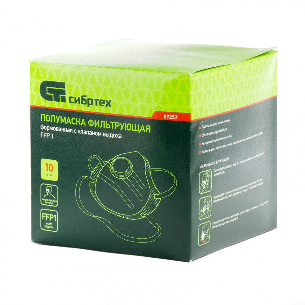 Фильтрующая полумаска (респиратор) Сибртех 89252, с клапаном выдоха, 10 шт., класс FFP1, обеспечит защиту органов дыхания при содержании вредного вещества в воздухе в количестве до 4 предельно допустимых концентраций (ПДК). Изделие обеспечивает степень фильтрации воздуха до 80%. Респиратор будет полезен работникам предприятий в условиях вредных факторов.ПреимуществаПолумаски изготовлены из текстурированного полипропилена, хорошо пропускающего воздух, поэтому в них легко дышать.Благодаря клапану выдоха снижается влажность и температура внутри респиратора.Изделия подходят любому типу лица, т.к. имеют чашеобразную форму и эластичные резинки оголовья.За счет формованного типа респираторы устойчивы к смятию.Благодаря широким кромкам по полосе обтюрации полумаски не доставляют дискомфорта при ношении.Комплекта хватит на небольшую бригаду, т.к. упаковка включает 10 масок.Гарантией качества масок является сертификат соответствия ТР ТС 019/2011 «О безопасности средств индивидуальной защиты».