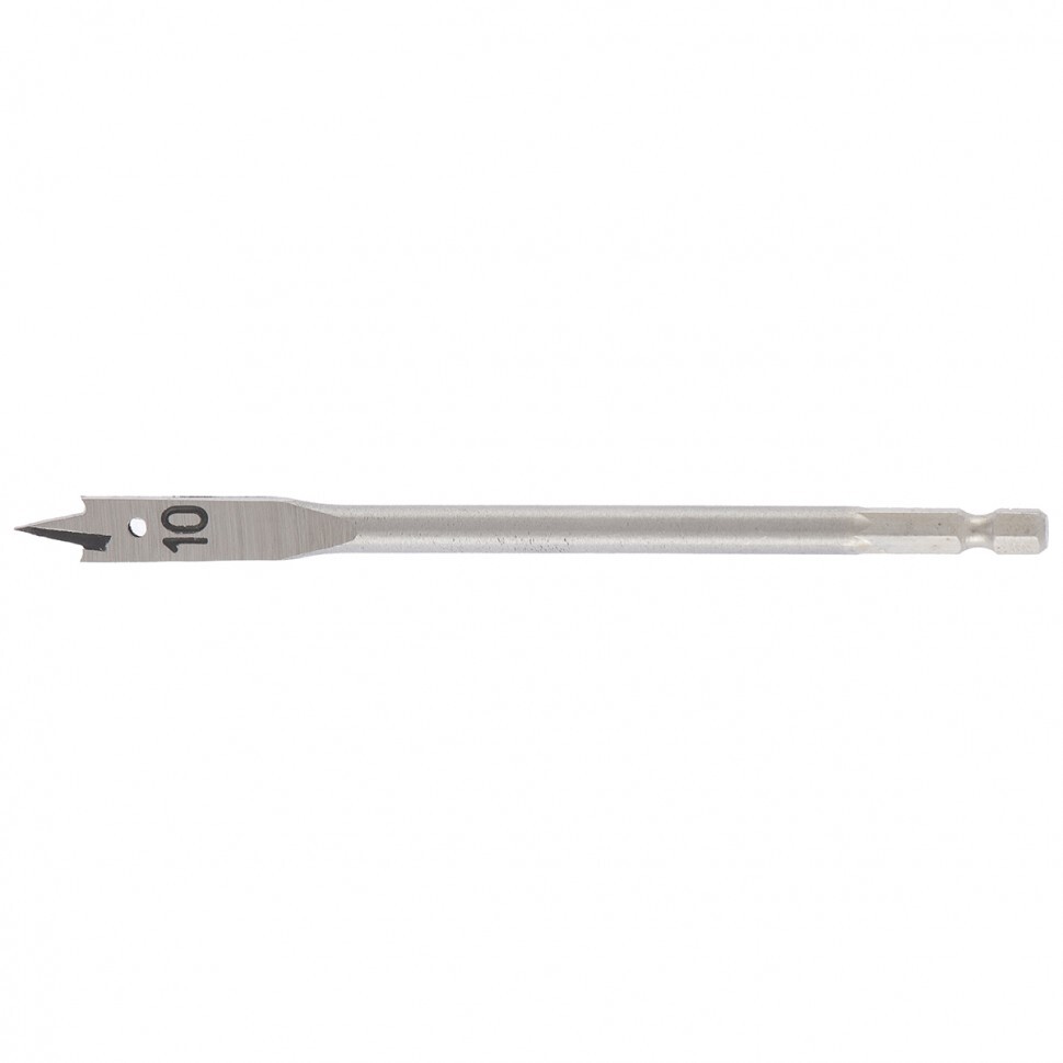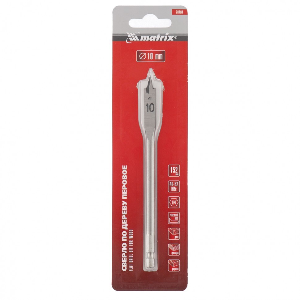 Перовое сверло по дереву Matrix 70404 диаметром 10 мм, с 6-гранным хвостовиком, имеет рабочую часть в виде «лопатки» с режущими кромками по бокам, поэтому эффективно для сверления глубоких сквозных и глухих отверстий. Устанавливается на ручную механическую, электрическую дрель или шуруповерт, эффективно для сверления древесины любых пород.ПреимуществаПрочность и износостойкость — сверло выполнено из стали 45, режущие кромки закалены до твердости 48-52 HRC.Высокое качество проводимых работ — благодаря подрезателям на режущей части края отверстий получаются ровными.Возможность увеличить глубину сверления — оснастка совместима с удлинителем Matrix 70495.Комфортная работа — шестигранный хвостовик не проворачивается в патроне дрели или шуруповерта.