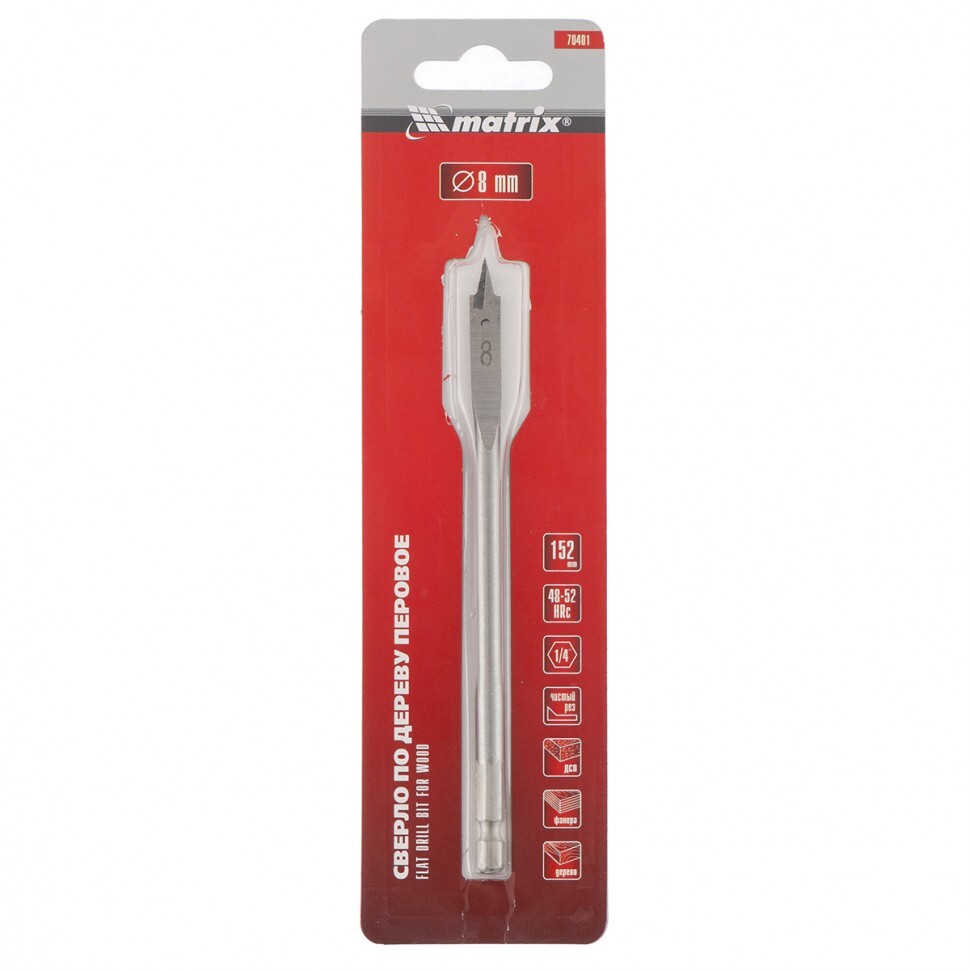 Перовое сверло по дереву Matrix 70401 диаметром 8 мм, с 6-гранным хвостовиком, имеет рабочую часть в виде «лопатки» с режущими кромками по бокам, поэтому эффективно для сверления глубоких сквозных и глухих отверстий. Устанавливается на ручную механическую, электрическую дрель или шуруповерт, эффективно для сверления древесины любых пород.ПреимуществаПрочность и износостойкость — сверло выполнено из стали 45, режущие кромки закалены до твердости 48-52 HRC.Высокое качество проводимых работ — благодаря подрезателям на режущей части края отверстий получаются ровными.Возможность увеличить глубину сверления — оснастка совместима с удлинителем Matrix 70495.Комфортная работа — шестигранный хвостовик не проворачивается в патроне дрели или шуруповерта.