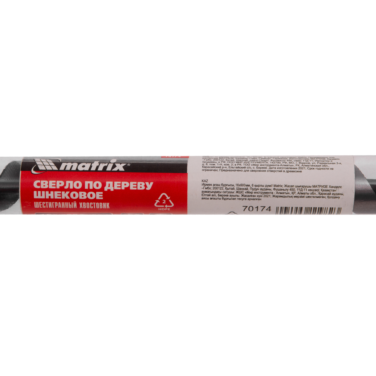 Шнековое сверло по дереву Matrix 70174 размером 16 х 600 мм, с 6-гранным хвостовиком, предназначено для получения глубоких отверстий. Подходит для работы как с мягкими, так и с твердыми породами древесины. Конструкция сверла рассчитана на интенсивное использование с высокими нагрузками в ходе строительных, ремонтных и отделочных работ.ПреимуществаПрочность и износостойкость — сверло изготовлено из инструментальной стали, а режущая часть закалена до твердости 40 HRC.Высокое качество выполняемых работ — шнек отшлифован до зеркального блеска, что позволяет получать гладкие и ровные отверстия.Глубокое сверление — массивная спираль обеспечивает эффективный отвод стружки.Удобная эксплуатация — центрирующее сверло уменьшает осевую нагрузку, облегчая засверливание и предотвращая смещение оснастки.Шестигранный хвостовик — сверло не проворачивается в патроне дрели.