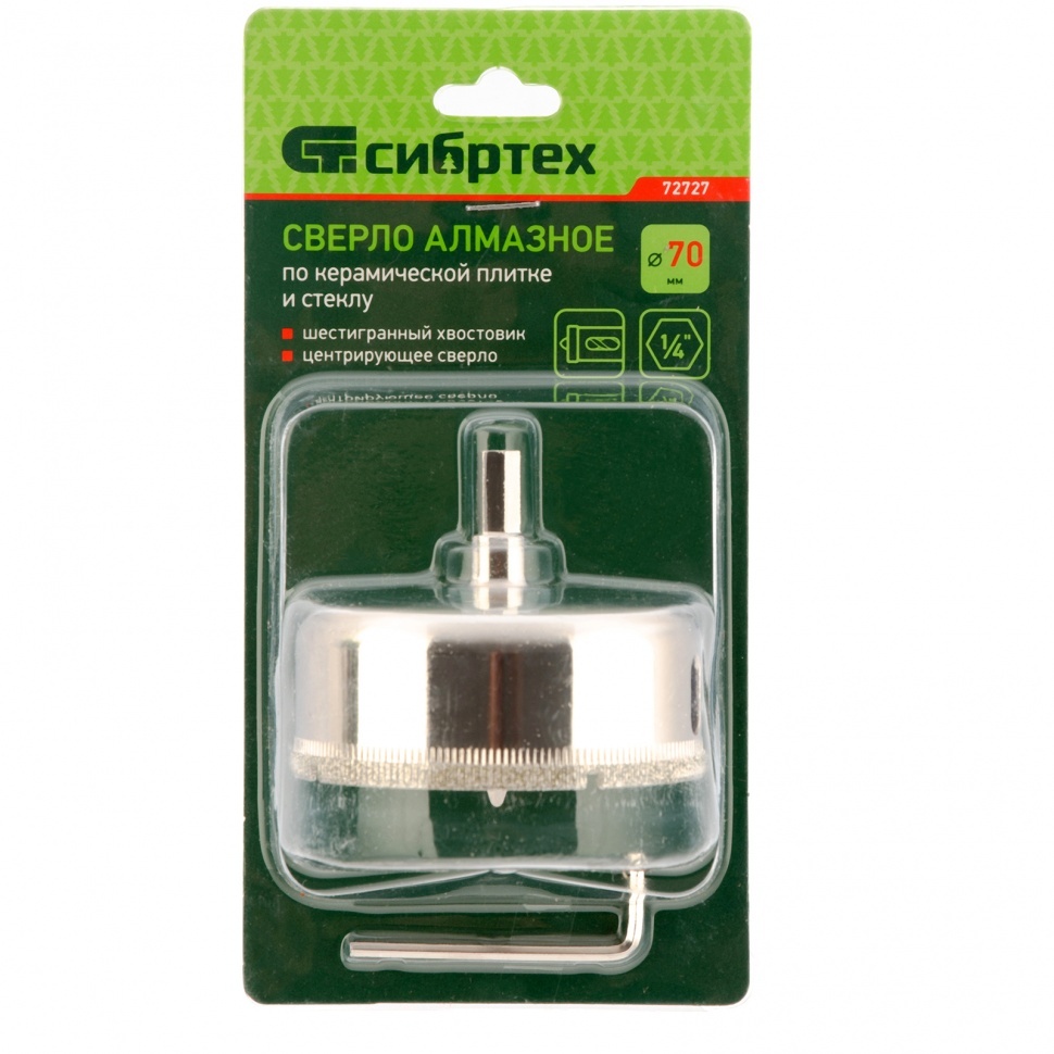 Сверло Сибртех 72727 размером 70 х 55 м, с 6-гранным хвостовиком и центрирующим сверлом, позволяет сверлить отверстия в керамической плитке и стекле. Его устанавливают на дрель или шуруповерт, рекомендуемый диапазон рабочих оборотов 350-700 об/мин. Благодаря 6-гранному хвостовику сверло не проворачивается в патроне электроинструмента. После заглубления алмазной коронки на 1-2 мм рекомендуется снять центрирующее сверло, это поможет увеличить его ресурс. Применение водяного охлаждения значительно повышает срок службы оснастки. Ее используют при выполнении бытовых ремонтных и отделочных работ. Преимущества Устойчивость к повышенным нагрузкам — коронка изготовлена из среднеуглеродистой стали 45. Точное позиционирование — центрирующее сверло быстро заглубляется в материал, не давая коронке сдвигаться во время сверления. Съемный центровик — при необходимости его можно заменить на сверло Сибртех 72709. Коррозионная стойкость — оснастка защищена специальным покрытием.