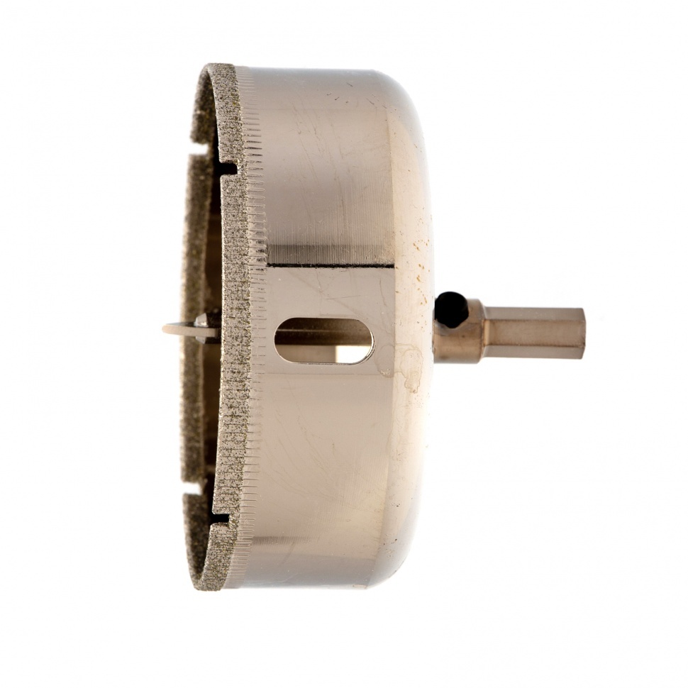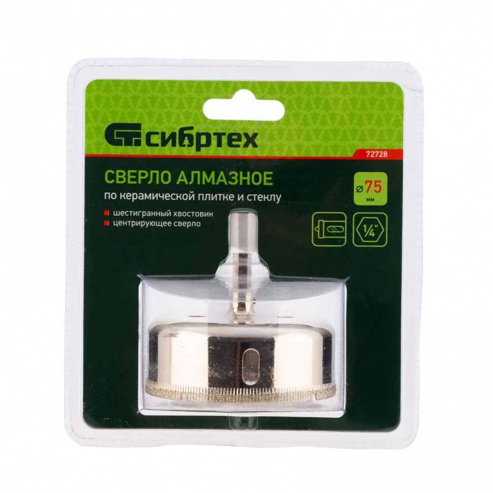 Сверло Сибртех 72728, 75 х 55 м, с 6-гранным хвостовиком и центрирующим сверлом позволяет сверлить отверстия в керамической плитке и стекле. Его устанавливают на дрель или шуруповерт, рекомендуемый диапазон рабочих оборотов 350-700 об/мин. Благодаря 6-гранному хвостовику сверло не проворачивается в патроне электроинструмента. После заглубления алмазной коронки на 1-2 мм рекомендуется снять центрирующее сверло, это поможет увеличить его ресурс. Применение водяного охлаждения значительно повышает срок службы оснастки. Ее используют при выполнении бытовых ремонтных и отделочных работ.ПреимуществаКоронка изготовлена из среднеуглеродистой стали марки 45, поэтому выдерживает повышенные механические нагрузки.Центрирующее сверло быстро заглубляется в материал, не давая коронке сдвигаться во время сверления.Центровик является съемным, при необходимости его можно заменить на сверло Сибртех 72709.Коррозионностойкое покрытие защищает оснастку от ржавчины при мокром сверлении, продлевая срок ее службы.